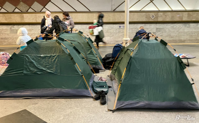 На станції метро «Теремки» люди перчікують повітряну тривогу у наметах. Фото: Олександр Галух