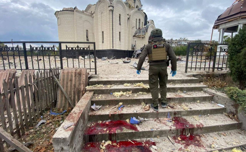 Він поширив фото з місця обстрілу. На них — закривавлена поранена жінка на ношах, тіло загиблого, а також пошкоджений храм і поліція, яка фіксує воєнний злочин росіян.