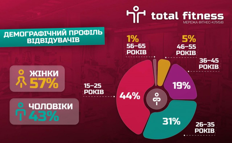 Сьогодні ситуація кардинально змінилася. Сучасний спортклуб — це простір для людей різного віку, рівня підготовки й стилю життя. За даними Всесвітньої організації охорони здоров’я, регулярна фізична активність знижує ризик серцево-судинних захворювань, поліпшує психічне здоров’я і допомагає підтримувати якість життя в будь-якому віці. Тому люди починають тренуватися в 40, 50 та навіть 60 років, а підлітки відкривають для себе фітнес як альтернативу пасивному дозвіллю. Про це свідчать дослідження Total Fitness, згідно з якими віковий розподіл відвідувачів має такий вигляд: