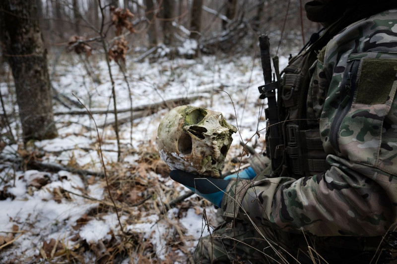 Волонтер пошукової групи «Плацдарм» збирає останки загиблих військових і цивільних поблизу села Довгеньке в Харківській області; 9 лютого. Tyler Hicks