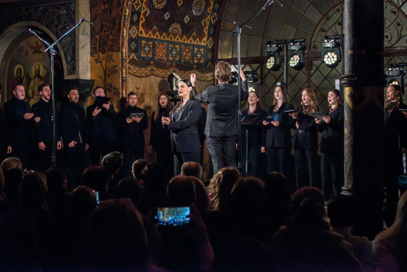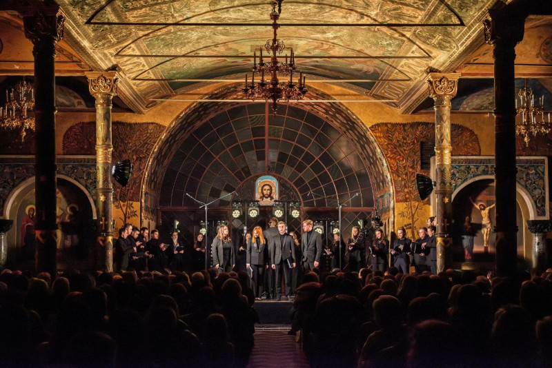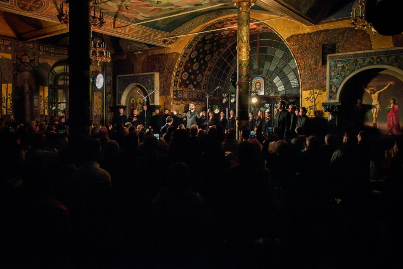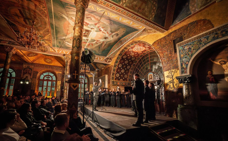 Під час виконання української духовної музики в її автентичному сакральному середовищі у Києво-Печерській лаврі.