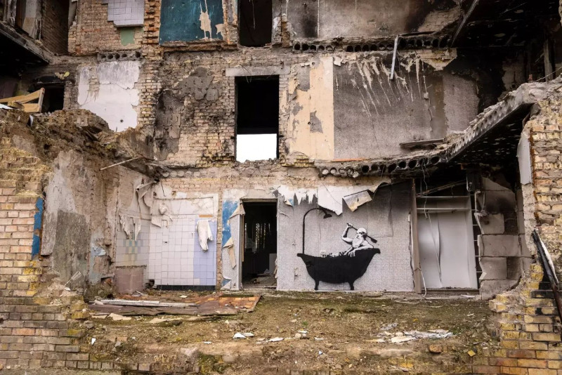 Масковані чоловіки несли картонні трафарети з швидкої допомоги і приклеїли їх до внутрішньої стіни квартири, перш ніж росіяни знищили це місце. Потім вони дістали балончики з фарбою і взялися до роботи. За кілька хвилин з’явилася абсурдна картина: бородатий чоловік у ванні, який миє спину серед уламків.