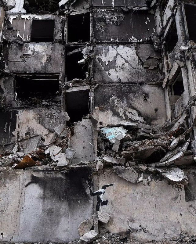 Гімнастка — малюнок Бенксі на зруйнованій багатоповерхівці під Києвом.