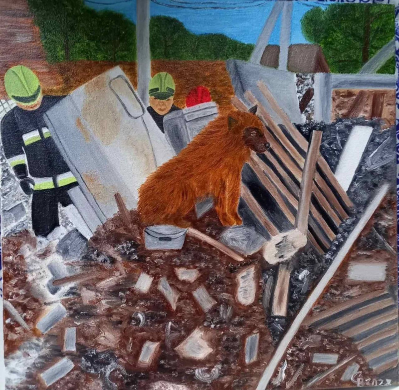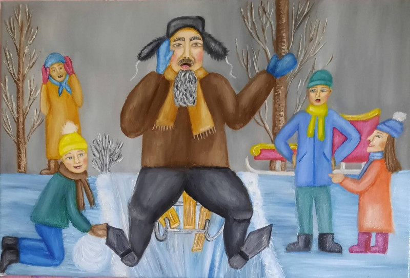 Через переказування фарбами на папері народних приказок, балачок. Наприклад, зараз працюю над картиною, яка відображає вислів «сидіти у батьків на шиї». Коли почалася війна, я теж не могла бути осторонь цієї теми й у мене народилася серія картин. На них — й постраждалі люди, розтрощені домівки, наші захисники та захисниці, пес Патрон. Дехто каже, що мій стиль — наївізм, наївний арт. Можливо, так й є. Я не дуже задумуюся над цим, просто працюю та й все.
