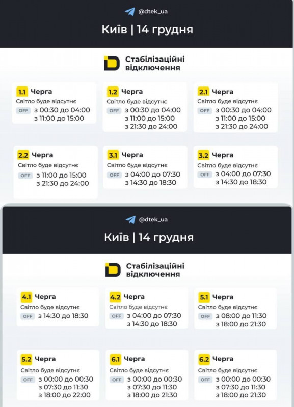 Сьогодні, 14 грудня, графіки погодинних відключень та графіки обмеження потужності (для промислових споживачів) застосовуватимуться в більшості регіонів.