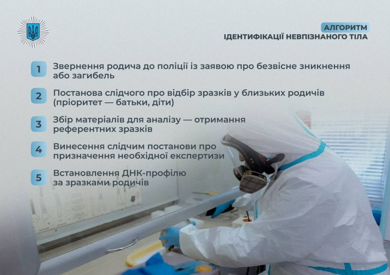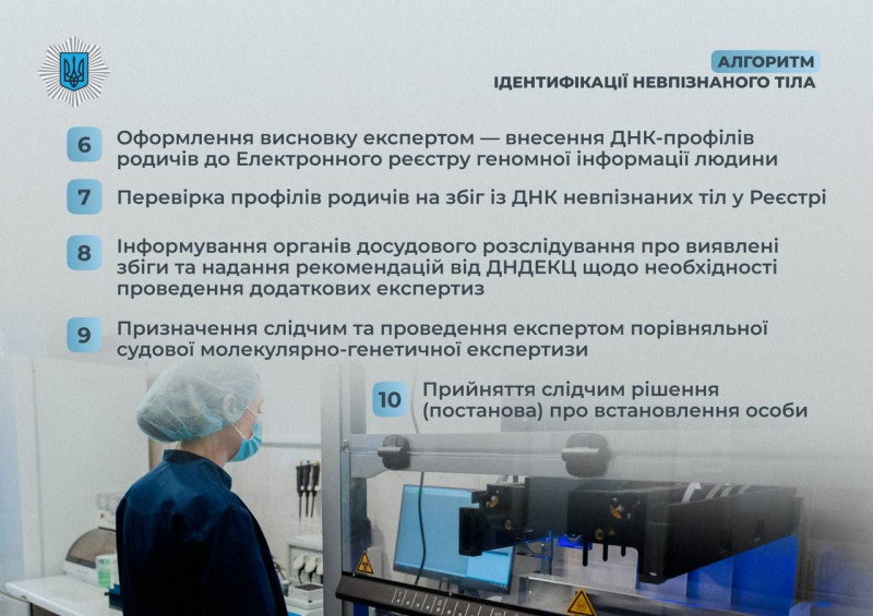 У МВС Україна наголошують, що процедура ідентифікації невпізнаних тіл відтепер проводиться виключно за зразками двох близьких родичів або за зразком одного родича — із використанням двох різних ДНК-методів.