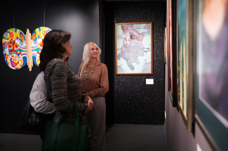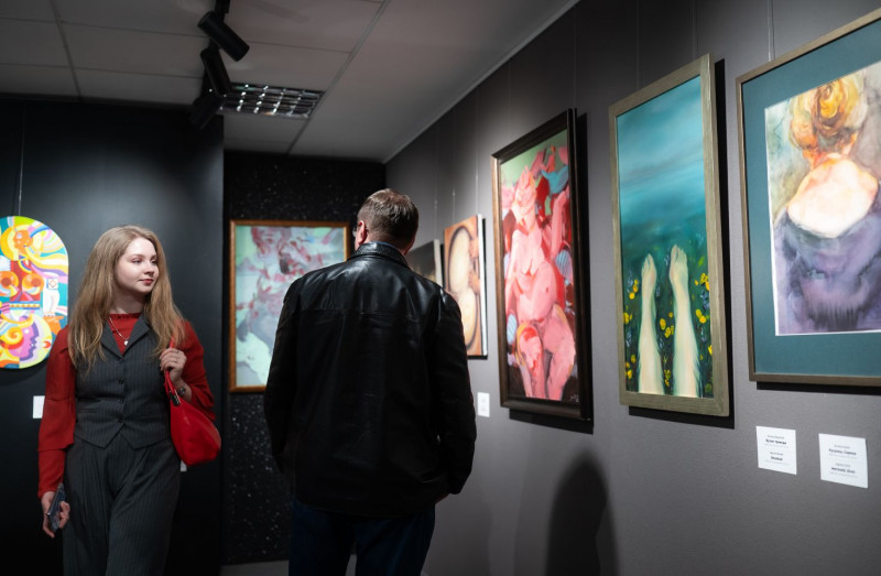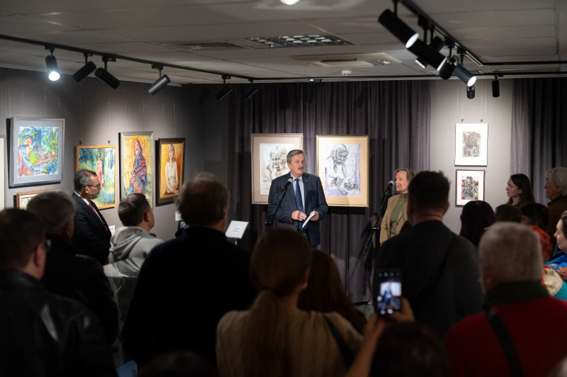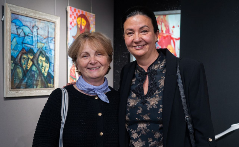 «Цього року пані посол Єва Ме запропонувала тему, яка дозволила нам подивитися на жінку крізь призму архаїчного, особистого, соціального. Жінки для кожного — щось своє: мама, сестра, бабуся, дружина, партнерка. І саме партнерство — як джерело безпеки — стало для мене ключовим. У нашому товаристві працюють митці різного віку — від 25 до 75 років. Тут є саморефлексійні роботи, є образи жінок очима чоловіків — ностальгійні, гумористичні, гротескні. Є художники, які показують себе, своїх бабусь, близьких. Я теж представила роботи про жіночий стан, про вікові зміни, про внутрішні переживання. І запрошую вас на кураторську екскурсію — там буде більше деталей, більше історій, більше технік», — звернулася до гостей кураторка виставки.
