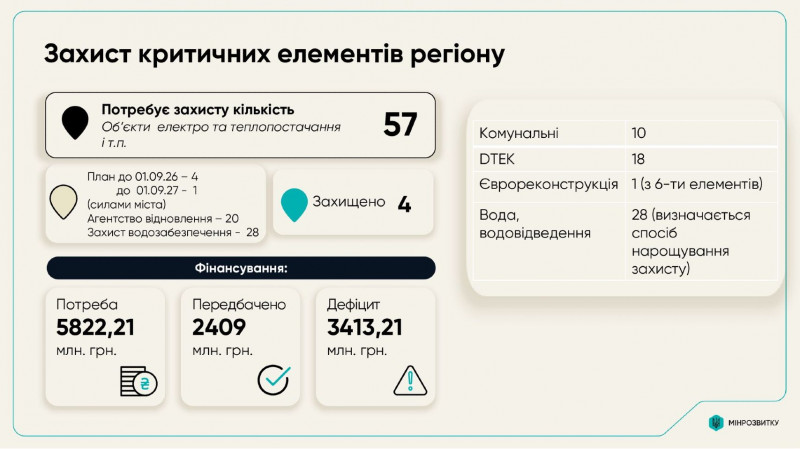 У відкритій частині плану зібрані ключові пропозиції щодо посилення захисту та резервування критичної інфраструктури Києва — зокрема в енергетиці, теплопостачанні та водозабезпеченні. Документ містить пропозиції щодо плану стійкості міста Києва станом на лютий 2026 року, а також параметри фінансування та дефіциту за окремими напрямами, включно із захистом об’єктів електро- і теплопостачання.