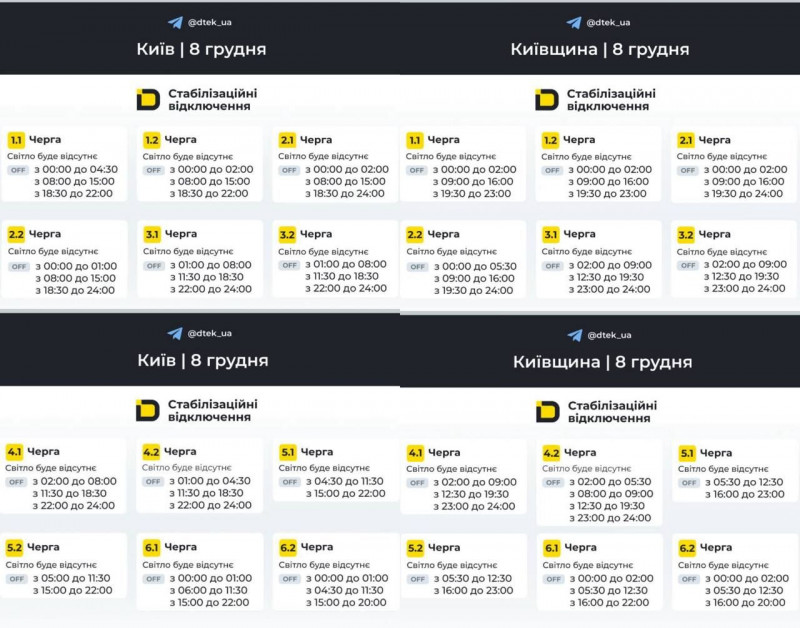 У понеділок, 8 грудня, в усіх регіонах України будуть вимикати світло за графіками. Обмеження діятимуть упродовж дня.