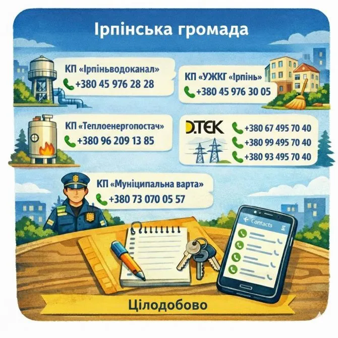 «До вашої уваги корисні телефони критично важливих установ громади, які працюють цілодобово та приймають звернення громадян. Збережіть ці контакти собі і передайте за потреби сусідам», — написав перший заступник Ірпінського міського голови Олександр Пащинський.