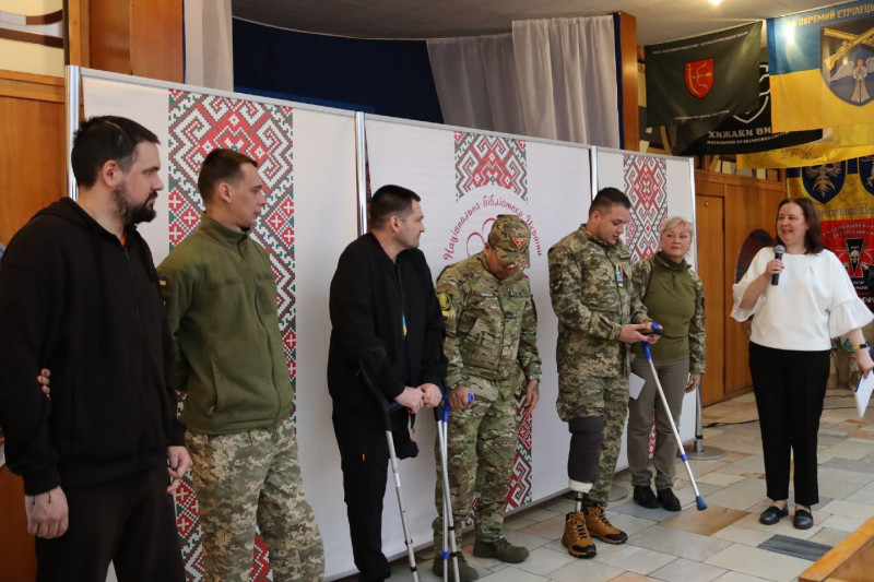 Генеральна директорка бібліотеки Алла Гордієнко відкрила виставку зі словами вдячності воїнам-захисникам, підкресливши, що вони не лише боронять країну, а й уміють передавати свої емоції через мистецтво.