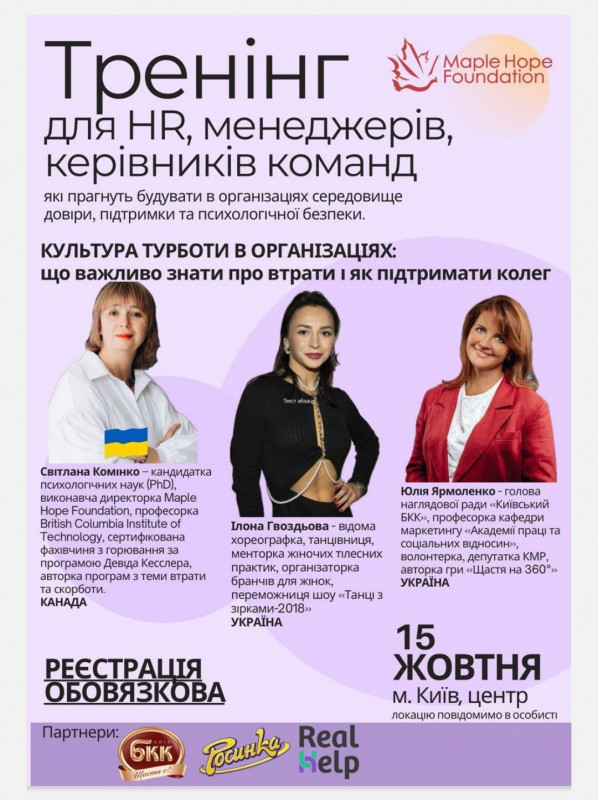 У сучасних організаціях дедалі більше уваги приділяється не лише результатам, а й людяності. Саме тому ініційовано благодійний захід «Культура турботи в організаціях: що важливо знати про втрати і як підтримати колег» — подію, що покликана допомогти лідерам створювати середовище довіри, підтримки та психологічної безпеки.