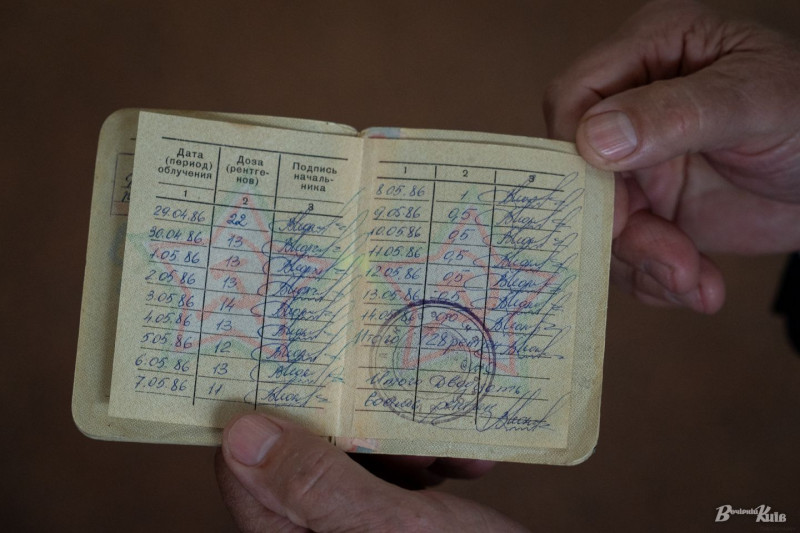 Анатолій Дацюк — ліквідатор, якому 40 років тому було 34. Сьогодні він показує два фото — тодішнє і нинішнє, а також військовий квиток радянського зразка, де вказана доза опромінення, яку він отримав на атомній станції.