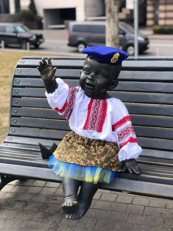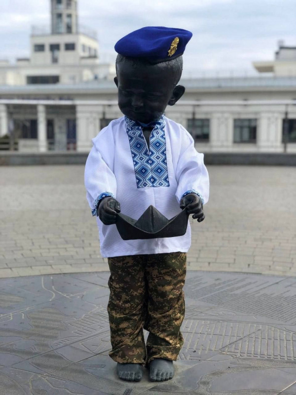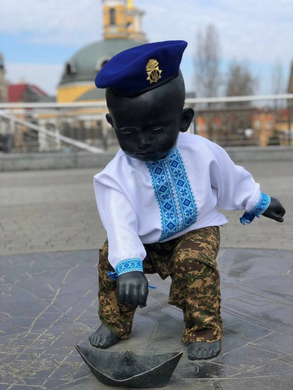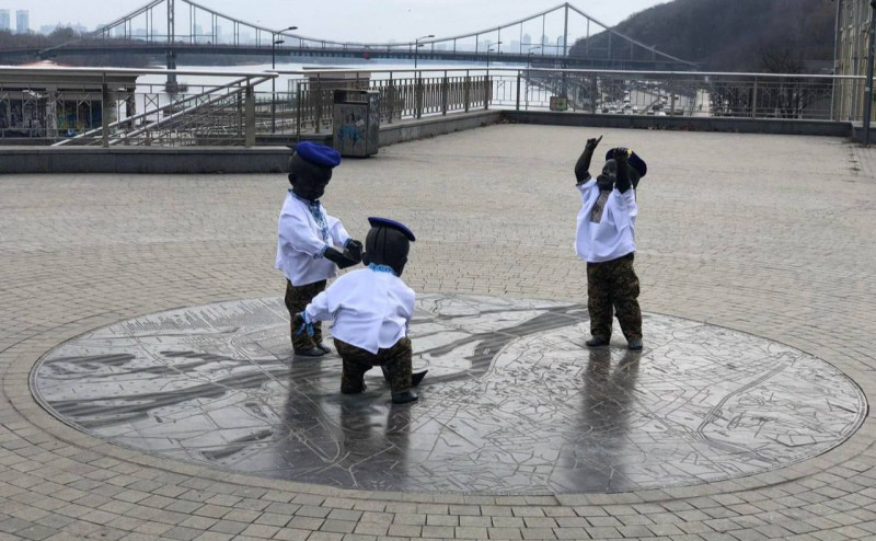 До річниці створення Національної гвардії України у столиці відбулася патріотична акція: скульптурна композиція «Малюки-засновники Києва» одягнулася у святкові костюми.