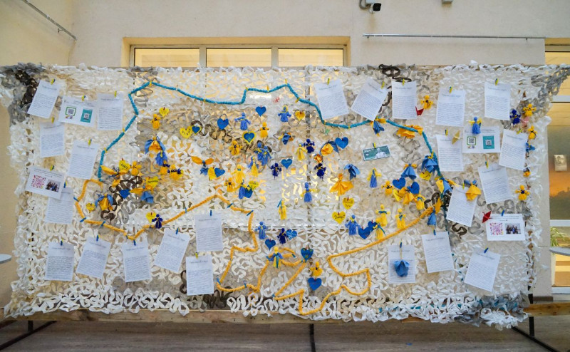 Експозиція демонструє велику маскувальну сітку. Її виготовили студенти разом з представницею Благодійного фонду «Волонтери ЛАД».
