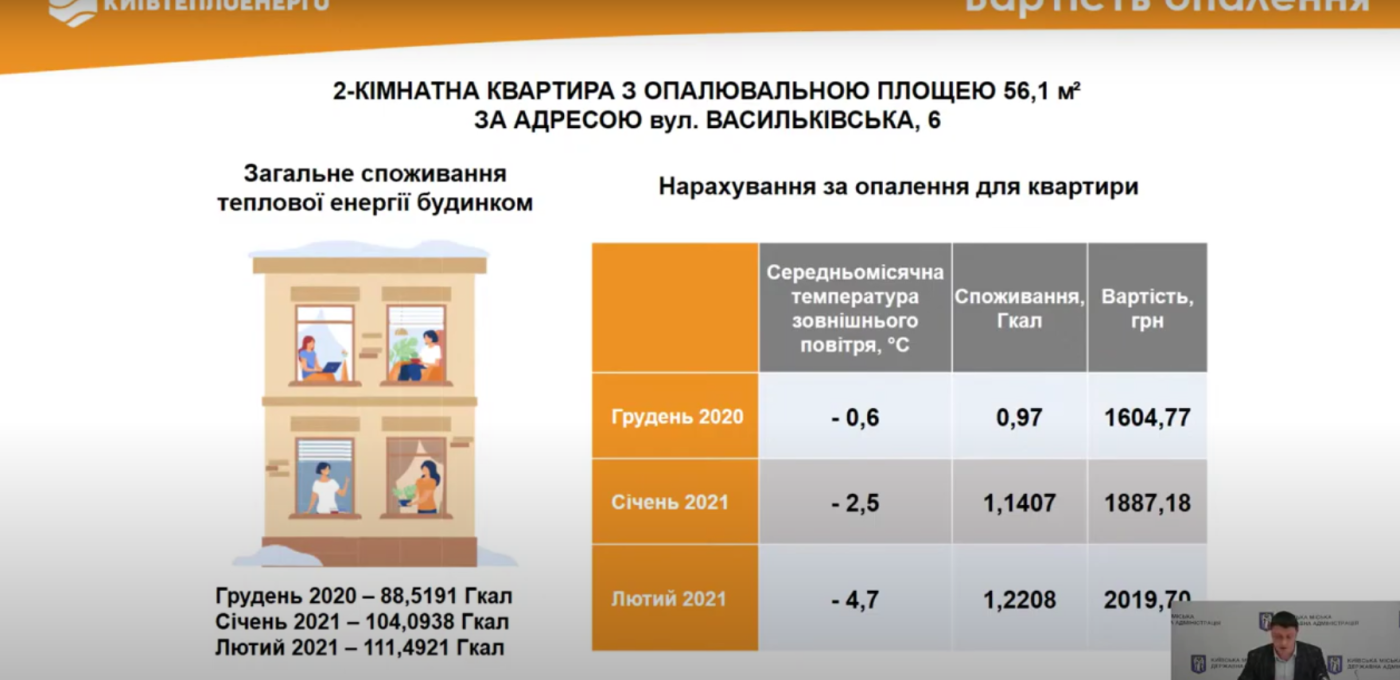 Пример начислений в двухкомнатной квартире Киева, Фото: скрин с онлайн-брифинге КП «Киевтеплоэнерго»