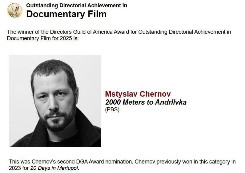 Це вже друга перемога Чернова на Премії Гільдії режисерів США. У 2024 році він був номінований на премію з фільмом 20 днів у Маріуполі та переміг.