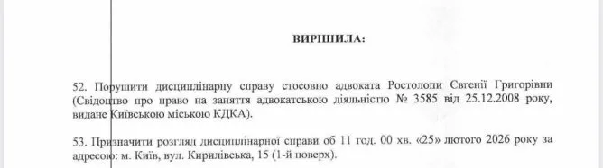 Комісія, розглянувши скаргу, призначила дисциплінарне провадження на кінець лютого. Водночас Євгенія Ростолопа не надала письмових пояснень щодо обставин справи у строки, встановлені комісією.