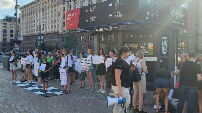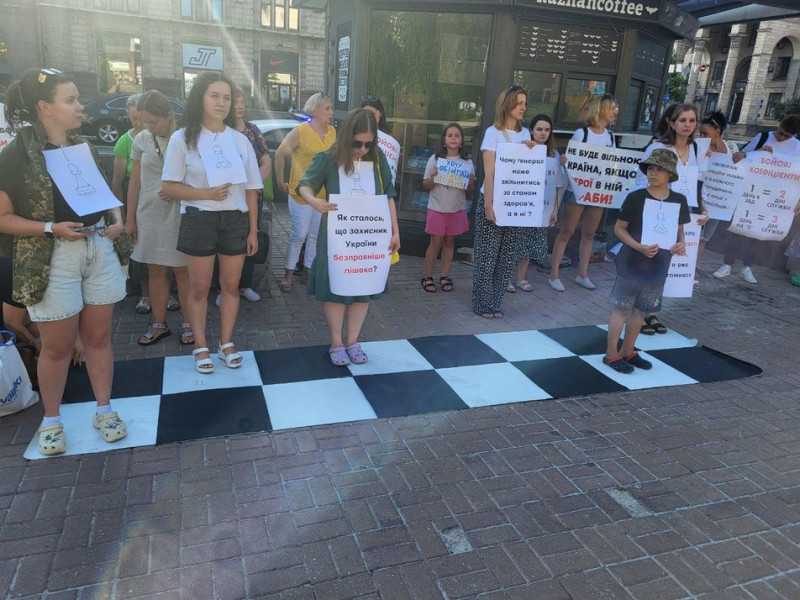 Також мітингувальники виклали на асфальті шахівницю і почепили на себе зображення пішаків, які, за їхніми словами, символізують рядових військових.