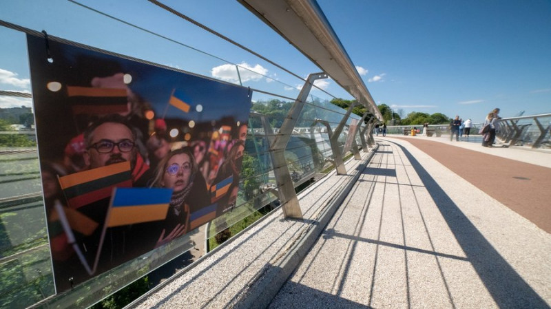 У Києві презентували фотовиставку "Міцні в єдності" до Дня Європи, яку розмістили на конструкціях Пішохідно-велосипедного мосту.