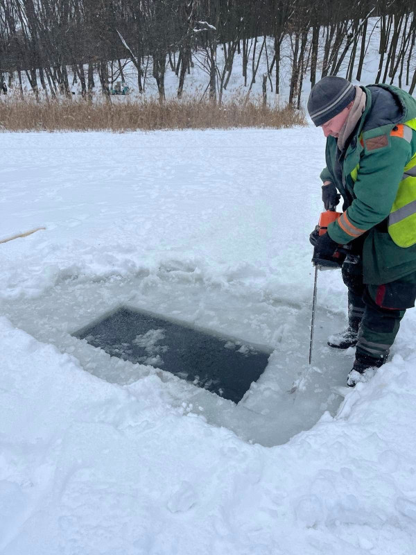 Працівники КП УЗН Голосіївського району продовжуємо робити ополонки в кризі для доступу кисню, щоб унеможливити загибель риб та інших водних організмів.