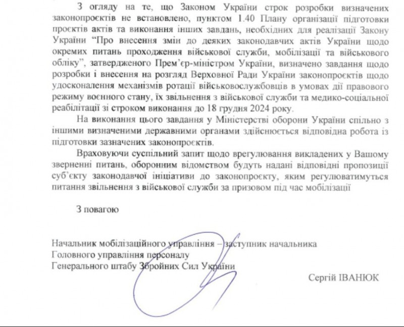 14 листопада членкиня оборонного комітету Верховної ради Соломія Бобровська повідомила Суспільному, що Міноборони планує до 18 грудня підготувати законопроєкт, який визначить порядок і умови звільнення військових зі служби. Водночас, вона вважає, що Міноборони, швидше за все, підготує законопроєкт таким чином, що в документі не буде чітко визначених строків служби.