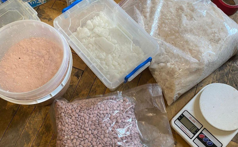 Під час обшуків у Києві та Сарнах вилучено понад 7 кг амфетаміну, майже 10 кг PVP, 50 г мефедрону, понад 5000 таблеток екстазі, понад 1 кг канабісу, а також ваги, пакувальні матеріали, чорнові записи і телефони.