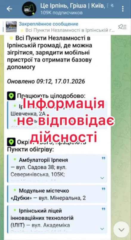 «Протягом останнього тижня теми енергопостачання та роботи Пунктів Незламності стали одними з ключових у всій Україні. Ірпінська громада — не виняток. Усі ми працюємо над тим, щоб у разі надзвичайної ситуації жителі мали доступ до тепла, світла та зв’язку. Втім, у публічному просторі з’являється недостовірна інформація, зокрема у деяких телеграм-каналах, щодо переліку місць обігріву в нашій громаді», — зазначив Пащинський.