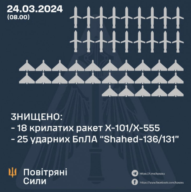 У ніч проти 24 березня сили протиповітряної оборони у межах Дніпропетровської, Херсонської, Миколаївської, Одеської, Сумської, Київської, Волинської та Львівської областей знищили 43 повітряні цілі: 18 ракет і 25 "шахедів".
