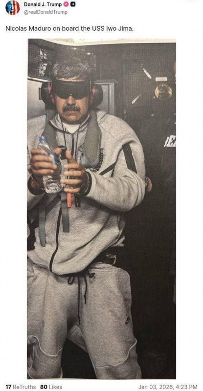 Президент США Дональд Трамп оприлюднив у соцмережі Truth Social фото Мадуро у кайданках із зав’язаними очима на борту авіаносця USS Iwo Jima. Його з дружиною вже доставили в Нью-Йорк.