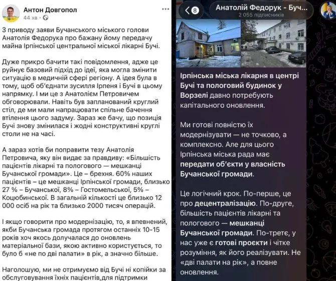 В.о. Ірпінського міського голови Анжела Макеєва у своєму телеграм-каналі повідомила, що рейдерські амбіції Бучі на приміщення стаціонару та пологового будинку Ірпінської ЦМЛ спостерігаються вже понад 10 років.