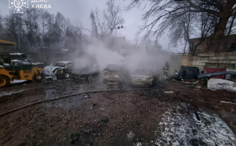 Зокрема, у Голосіївському районі падіння БпЛА спричинило пожежу трьох авто на території СТО. Пожежу ліквідовано.