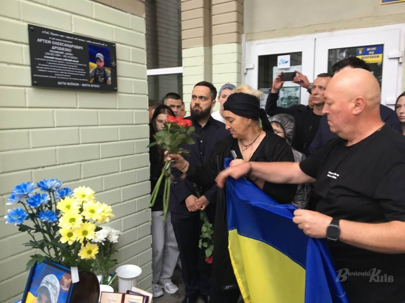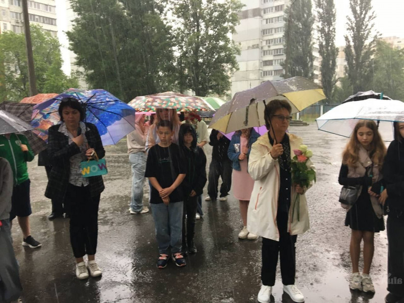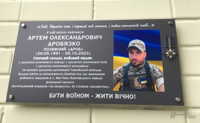 Під проливним дощем з грозою — у таку погоду відкривали на школі №298, на Оболоні, меморіальну дошчку на честь загиблого вирускника, військового медика Артема Дробязка.