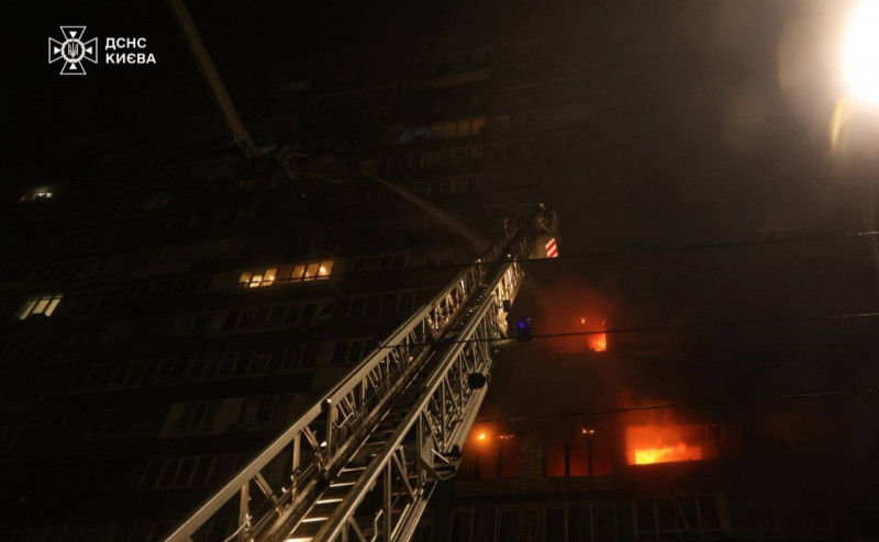 У Печерському районі уламки БпЛА влучили в багатоповерховий житловий будинок. Там палали квартири на кількох поверхах. Пожежу ліквідовано.