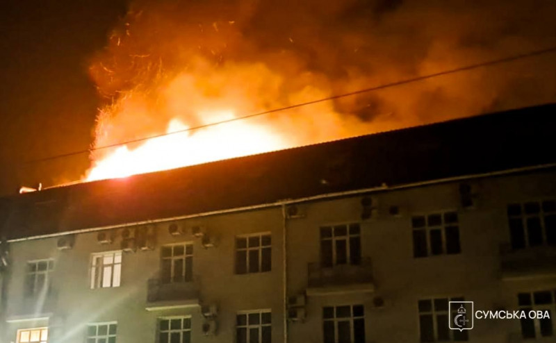 Пожежа у готелі після атаки рф. Фото: ДСНС Сум