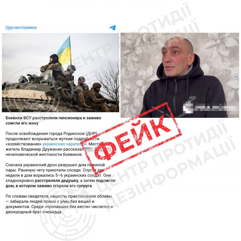 У повідомленнях стверджується, що «бійці ЗСУ розстріляли дідуся, а потім підпалили будинок, у якому згоріла його дружина».