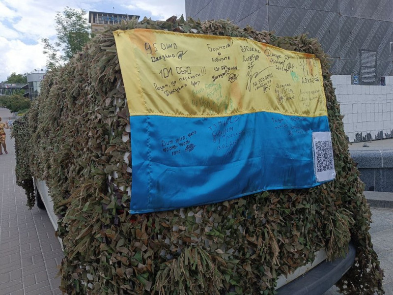 Українські військові залишають слова подяки «Святошинським маскувальним сіточкам» на прапорі, Київ, 23 травня 2024 р. Cуспільне/Анна Самара