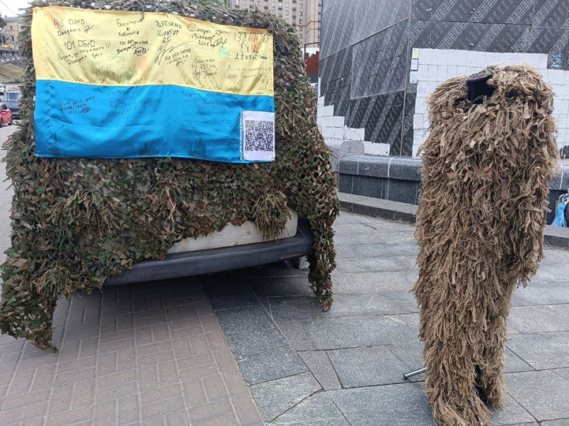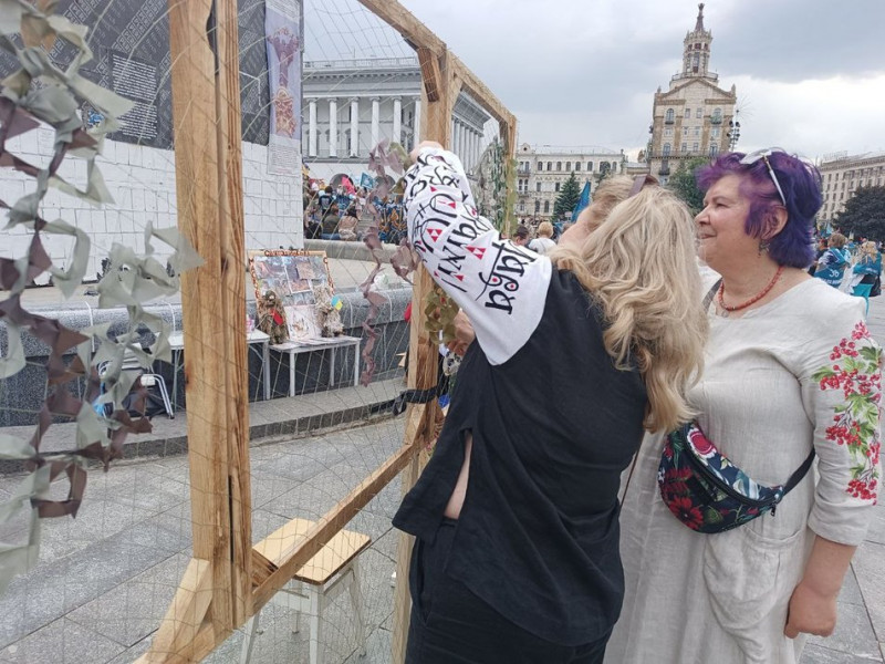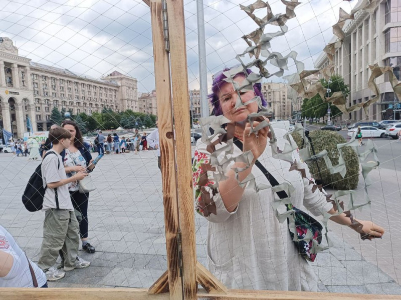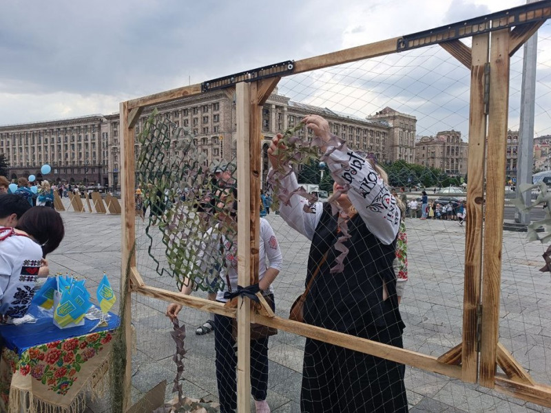 У центрі Києва долучитись до ініціативи й підтримати воїнів могли всі охочі — на Майдані встановили дерев'яні рами для створення маскувальних сіток.
