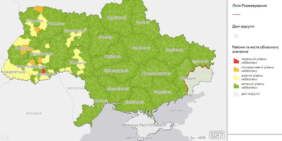 - Луцьк, Тернопіль, а також Кіцманський район Чернівецької області ввійшли до червоної. Київ і Київська область та більшість областей – до зеленої.
