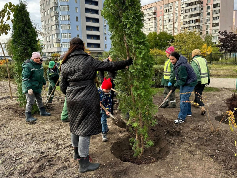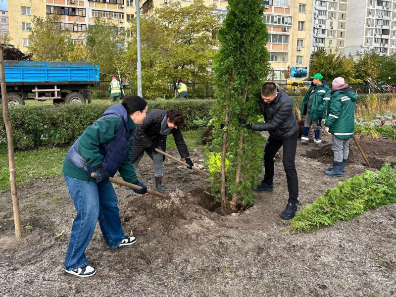 Сьогодні відбулася висадка туй — вічнозелених дерев, які прикрасили сквер на проспекті Петра Григоренка, 36-38 і стали завершальним штрихом у його облаштуванні. Про це повідомили у КО «Київзеленбуд».