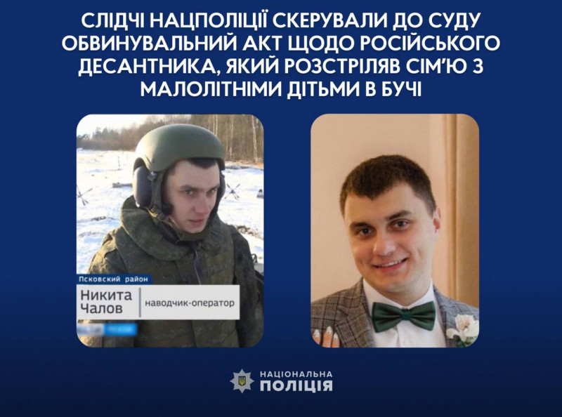 Слідчі Нацполіції скерували до суду обвинувальний акт щодо російського десантника, який розстріляв сімʼю з малолітніми дітьми в Бучі. Про це повідомили у Національній поліції України.