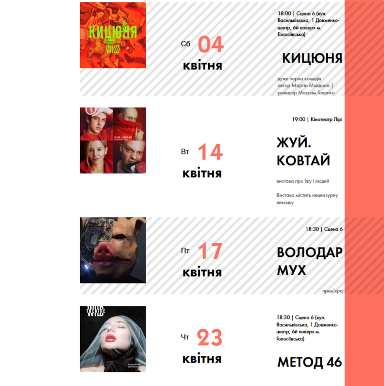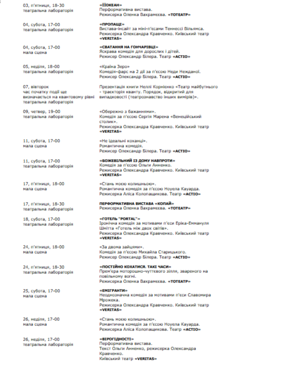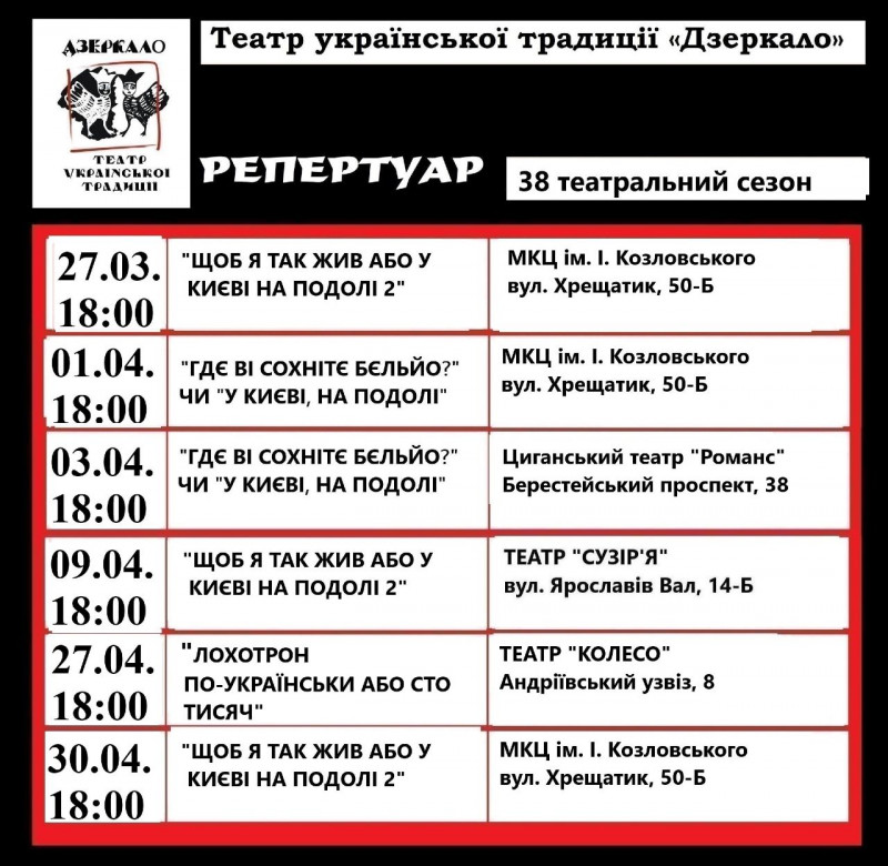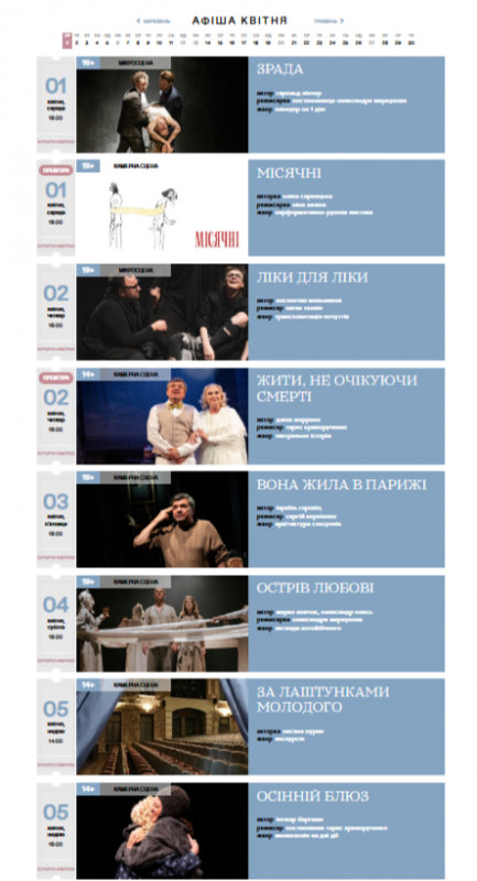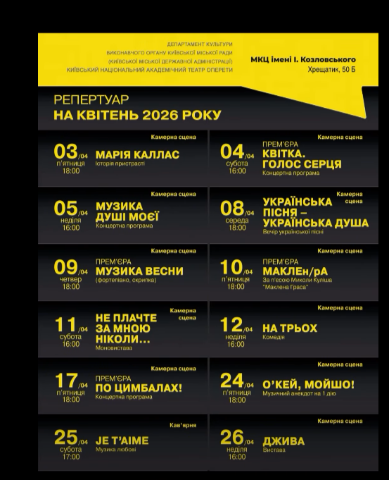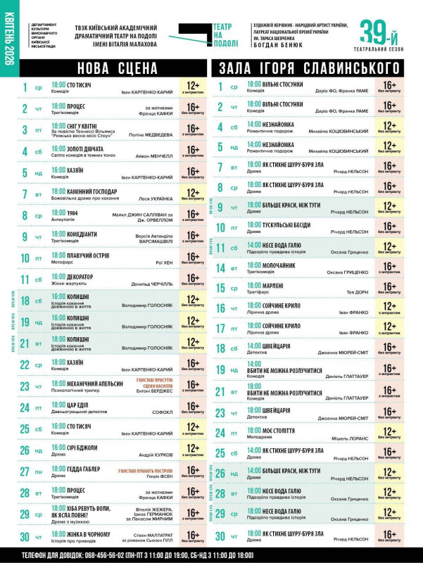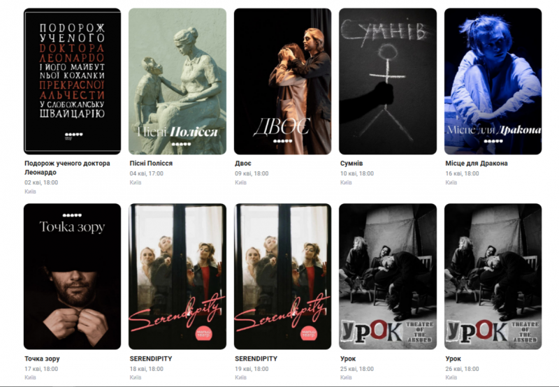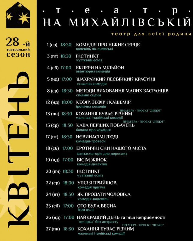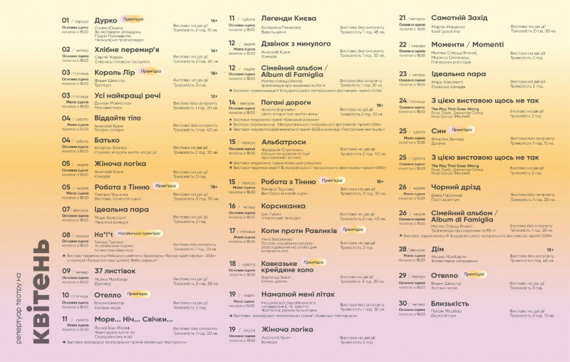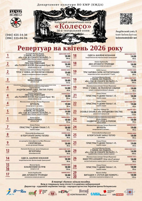 Для вашої зручності ми зібрали афіші столичних закладів із репертуаром на місяць. Обирайте вистави, які вам до вподоби, та підтримуйте київські театри!