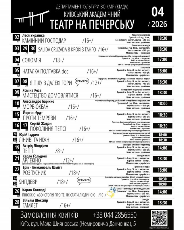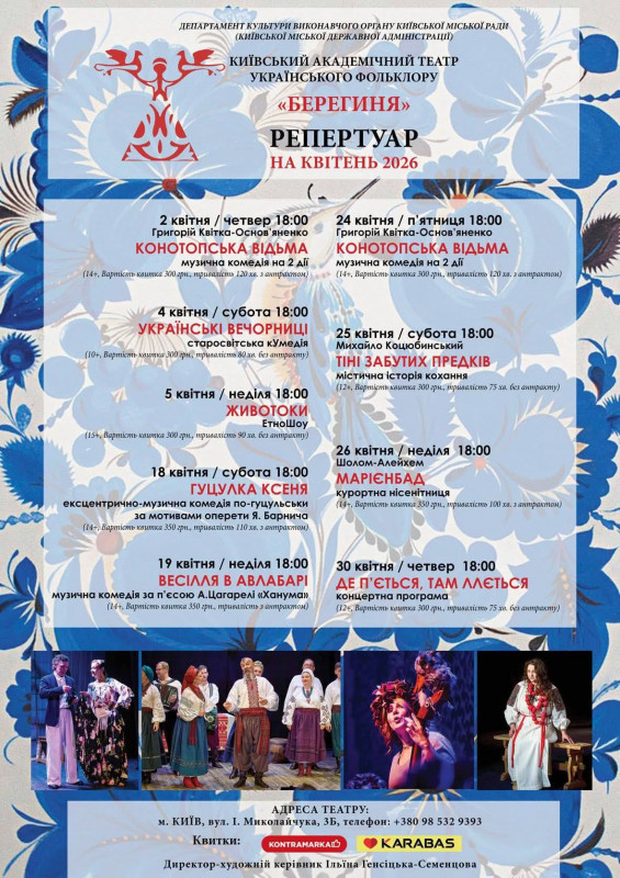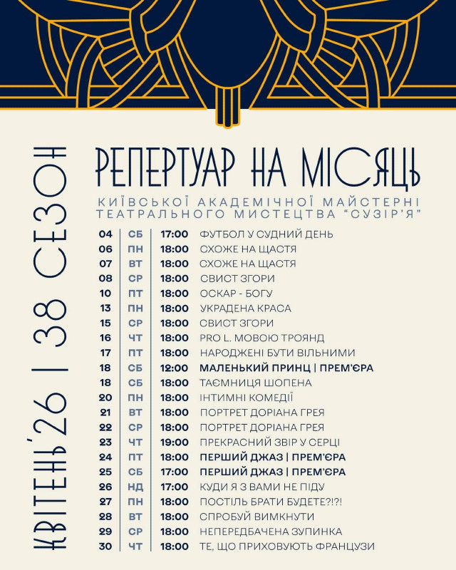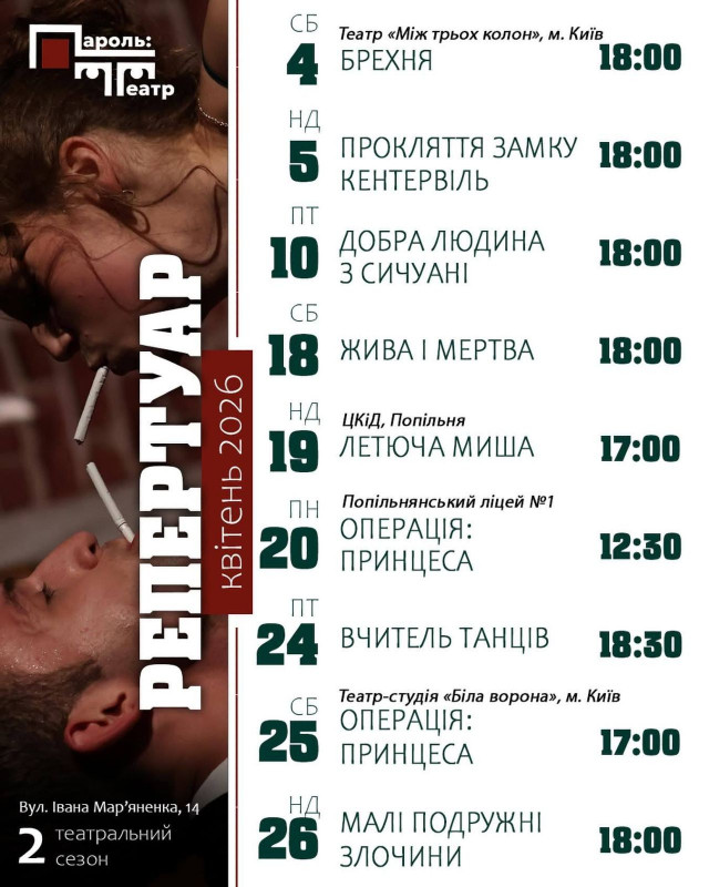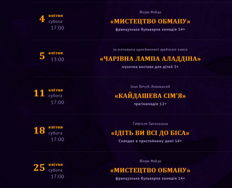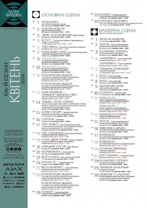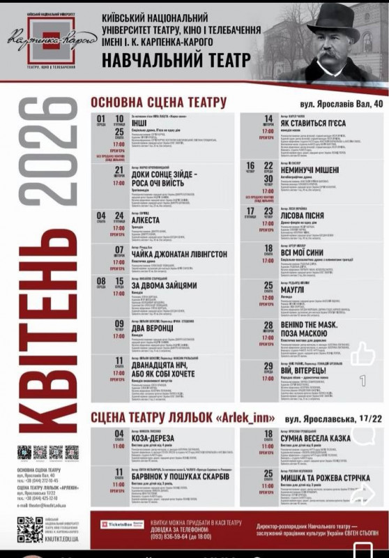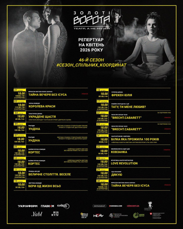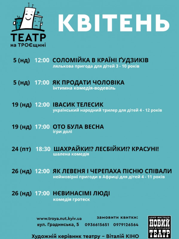 Для вашої зручності ми зібрали афіші столичних закладів із репертуаром на місяць. Обирайте вистави, які вам до вподоби, та підтримуйте київські театри!