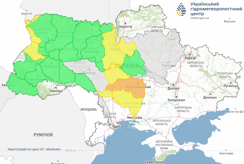 Жовтим кольором позначено райони з небезпечними гідрологічними явищами І рівня небезпеки (НГЯ І)