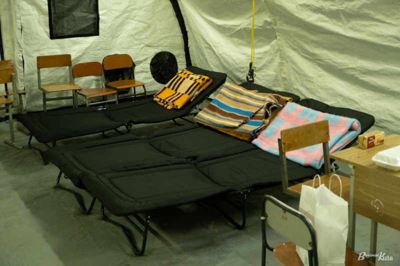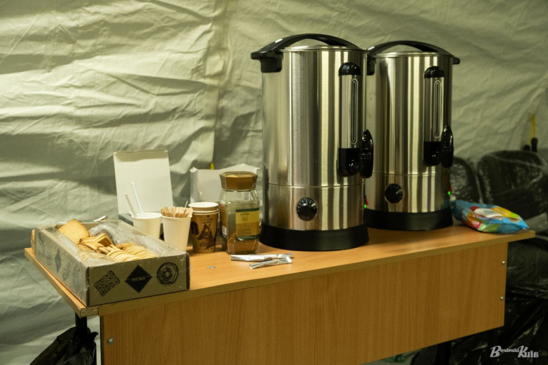 У наметах тепле повітря, багато місця, є стільці і столи. Кожному, хто зайшов пропонують гарячі напої — чай, каву та печиво. Є мінеральна вода. Люди кажуть, що у багатьох в будинках електроплити, то ж за відсутності світла — тут харчуються і дорослі і діти.