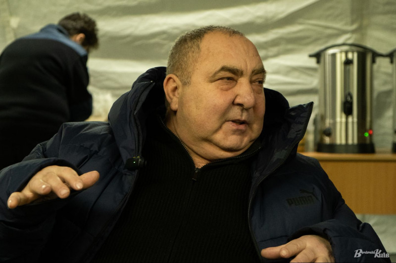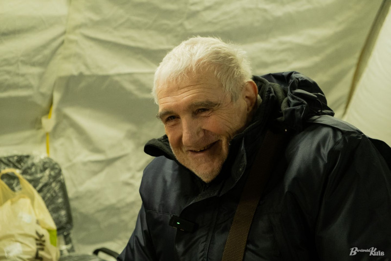Киянин Віктор, пенсіонер, мешкає в одному з будинків по вулиці Лаврухіна і ходить з сусідами до наметів — погрітись та поспілкуватись.