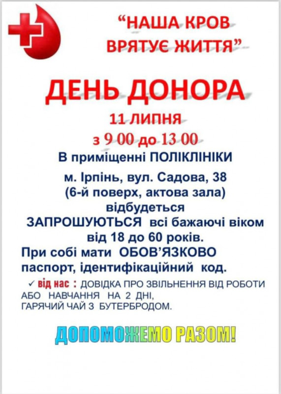 11 липня з 9.00 до 13.00 в приміщенні ірпінської міської центральної лікарні кожен охочий зможе здати кров. Про це повідомили на сторінці лікарні у фейсбуці.