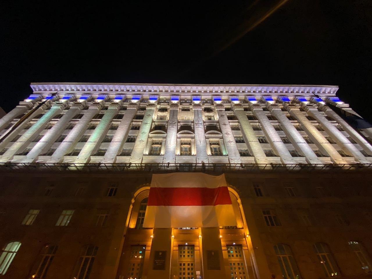 Большой флаг установили при входе в Киевскую городскую государственную администрацию в поддержку белорусских протестующих.