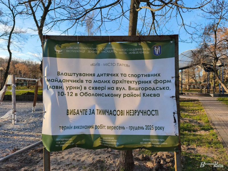 Незабаром відкриття двох майданчиків для дітей і для занять спортом на свіжому повітрі. Вони змонтовані на прогулянковій алеї вздовж вулиці Вишгородської 10 -12. Замовником робіт виступає КО «Київзеленбуд».