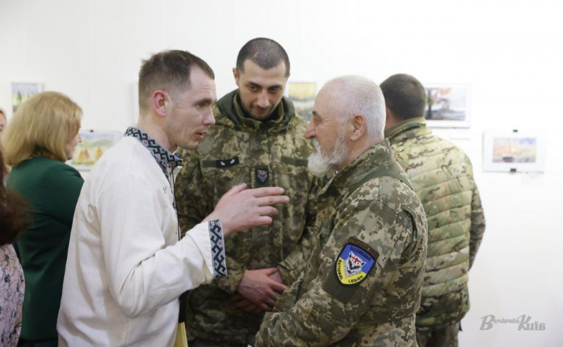 Іван Любиш-Кирдей спілкується з військовими на виставці акварелей «Відродження». Фото: Борис Корпусенко